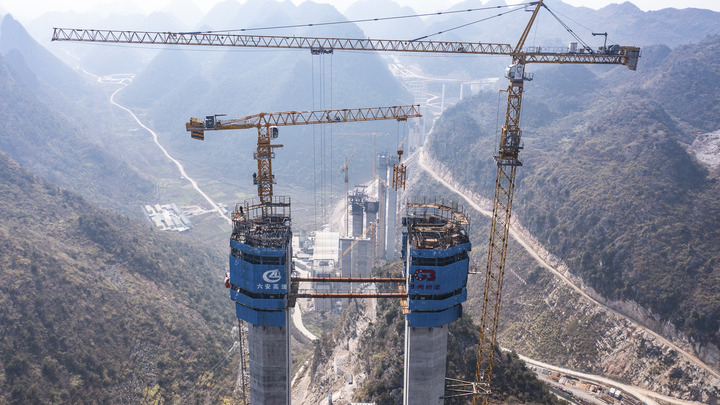 1月31日拍攝的六安高速花江峽谷大橋施工現場(chǎng)(無(wú)人機照片)。新華社記者 陶亮 攝