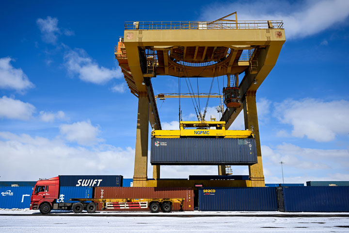 一輛貨車(chē)在滿(mǎn)洲里站貨運車(chē)間集裝箱場(chǎng)裝卸集裝箱(3月15日攝)。新華社記者 貝赫 攝