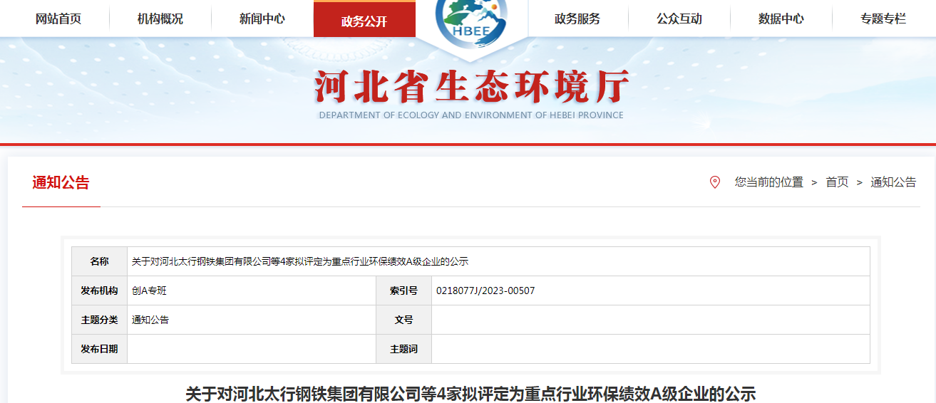 河北太行鋼鐵集團有限公司等4家擬評定為行業(yè)環(huán)???jì)效企業(yè)