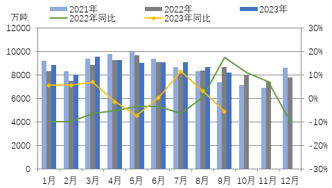 9月份,受到政策組合拳落地見(jiàn)效的原料成本支撐的強推升、旺季需求不足的弱現實(shí)等因素的共同影響,鋼廠(chǎng)產(chǎn)能的釋放力度有所下降。據國家統計局數據顯示,2023年9月份,生鐵產(chǎn)量7154萬(wàn)噸,同比下降3.3%;粗鋼產(chǎn)量8211萬(wàn)噸,同比下降5.6%;均由上月的增長(cháng)轉為下降(詳見(jiàn)圖2);鋼材產(chǎn)量11782萬(wàn)噸,同比增長(cháng)5.5%,同比增速較上月收窄5.9個(gè)百分點(diǎn)。
