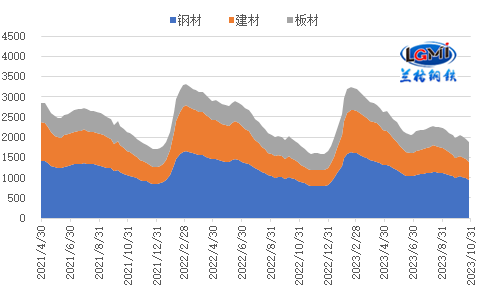 2023年10月份,鋼材社會(huì )庫存在國慶節后短暫回升后,呈現持續下降態(tài)勢。據蘭格鋼鐵網(wǎng)監測數據顯示,截至10月底,蘭格鋼鐵網(wǎng)統計的29個(gè)城市鋼材社會(huì )庫存為938.9噸,月環(huán)比下降4.8%,年同比上升1.3%。其中,建材社會(huì )庫存為440.8萬(wàn)噸,月環(huán)比下降10.7%,年同比下降2.7%;板材社會(huì )庫存為498.0萬(wàn)噸,月環(huán)比上升1.2%,年同比上升5.0%(詳見(jiàn)圖3)。