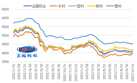 據蘭格鋼鐵網(wǎng)監測數據顯示,截至10月底,蘭格鋼鐵全國鋼材綜合價(jià)格為4106元/噸,較上月末下跌9元/噸,環(huán)比跌幅為0.2%,年同比上漲0.7%。其中,長(cháng)材價(jià)格為3949元/噸,較上月末上漲39元/噸,環(huán)比漲幅1.0%,年同比上漲0.3%;板材價(jià)格為4194元/噸,較上月末下跌45元/噸,環(huán)比跌幅1.1%,年同比上漲3.1%;型材價(jià)格指數為4023元/噸,較上月末下跌14元/噸,環(huán)比跌幅為0.4%,年同比下跌3.3%;管材價(jià)格為4523元/噸,較上月末下跌59元/噸,環(huán)比跌幅為1.3%,年同比下跌5.7%(詳見(jiàn)圖1)。