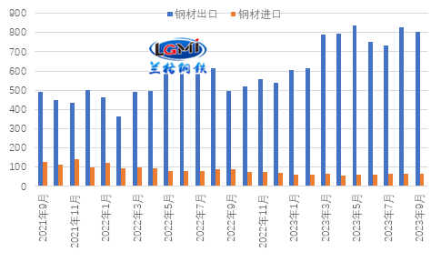 在價(jià)格優(yōu)勢及前期訂單回升影響下,9月份我國鋼材出口雖環(huán)比小幅回落、但同比大幅增長(cháng)。海關(guān)總署統計數據顯示,2023年9月份,我國出口鋼材806.3萬(wàn)噸,同比增長(cháng)61.9%(詳見(jiàn)圖4);1-9月,我國出口鋼材6681.8萬(wàn)噸,同比增長(cháng)31.8%。進(jìn)口方面,9月份,我國進(jìn)口鋼材64.0萬(wàn)噸,同比下降28.2%;1-9月,我國進(jìn)口鋼材569.8萬(wàn)噸,同比下降31.7%。