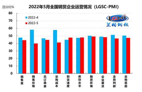 蘭格鋼鐵云商平臺統計發(fā)布的2022年5月份鋼鐵流通業(yè)PMI總指數為47.2%,比上月下降3.4個(gè)百分點(diǎn),再次進(jìn)入收縮區間。從分類(lèi)指數看,構成鋼鐵流通業(yè)