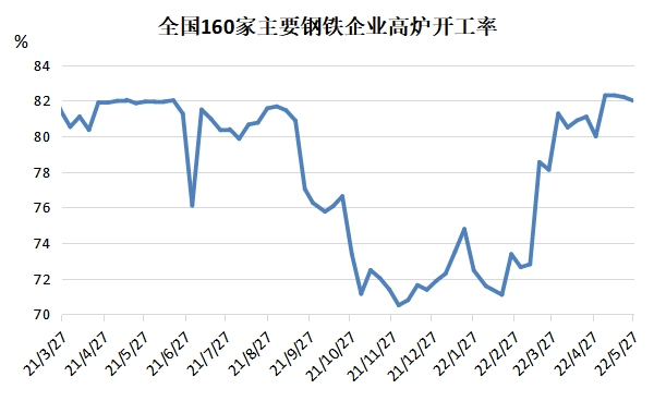 據蘭格鋼鐵網(wǎng)統計數據顯示,截止到5月27日全國160家主要鋼鐵企業(yè)高爐開(kāi)工率為82.00%,較4月底上漲2個(gè)百分點(diǎn)。目前以唐山為代表的的北方鋼廠(chǎng)減產(chǎn)意愿不強,以華東為代表的的南方鋼廠(chǎng)梅雨季節將至,更傾向暫時(shí)減產(chǎn)以緩解庫存壓力。另外,根據中鋼協(xié)統計重點(diǎn)企業(yè)生產(chǎn)情況來(lái)看,截止到5月中旬,累計日產(chǎn)粗鋼230.12萬(wàn)噸,環(huán)比增長(cháng)1.26%。