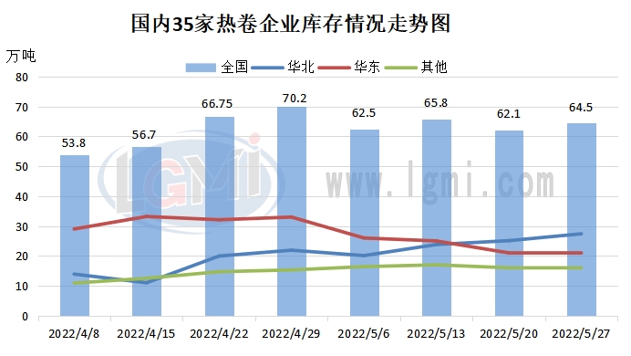 鋼廠(chǎng)熱卷庫存高位情況有所緩解。據蘭格鋼鐵云商平臺監測數據顯示,截止本月底,全國35家樣本鋼企熱卷廠(chǎng)內庫存為64.50萬(wàn)噸,較4月底減少5.7萬(wàn)噸或8.12%。