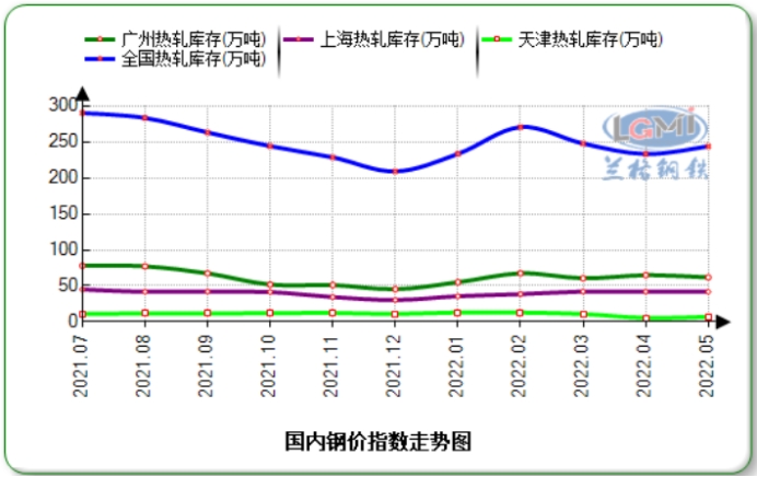 近期熱卷市場(chǎng)價(jià)格持續弱勢,特別是五月份以來(lái),市場(chǎng)整體跌勢加重。據蘭格鋼鐵網(wǎng)統計數據顯示,截止5月30日,5月天津市場(chǎng)包鋼均價(jià)為4882元,環(huán)比下跌309元;上海市場(chǎng)沙鋼均價(jià)4813元,環(huán)比下跌316元;樂(lè )從市場(chǎng)桂萬(wàn)鋼4860元,環(huán)比下跌303元。本月熱卷市場(chǎng)雖有政策面消息不斷釋放,但弱需求仍占據主導因素,真實(shí)需求未有明顯放量下,業(yè)者謹慎心態(tài)升級利空入市采購謹慎,市場(chǎng)成交承壓下挫。