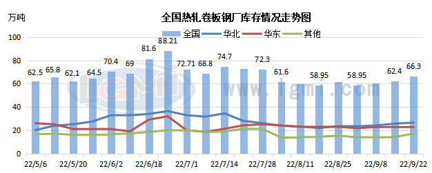 鋼廠(chǎng)庫存有所抬升。受鋼廠(chǎng)產(chǎn)量增加但需求不及預期影響,下游貿易商接貨速度放緩,利空鋼廠(chǎng)熱卷庫存有所增加。據蘭格鋼鐵網(wǎng)監測數據顯示,截止9月22日,全國35家樣本鋼企熱卷廠(chǎng)內庫存為66.3萬(wàn)噸,較8月底增加4.65萬(wàn)噸。