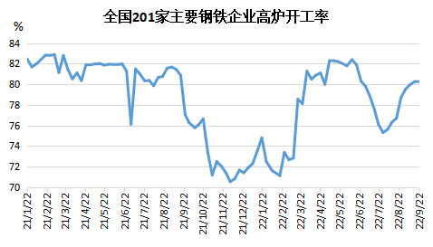 據蘭格云商平臺監測數據顯示,截止到2022年9月22日,9月份全國201家生產(chǎn)企業(yè)650座高爐開(kāi)工率均值為79.99%,環(huán)比上漲3.16個(gè)百分點(diǎn),同比上漲0.53個(gè)百分點(diǎn)。隨著(zhù)鋼廠(chǎng)盈利水平好轉以及前期高爐檢修結束,本月鋼廠(chǎng)開(kāi)啟復工復產(chǎn)模式,高爐開(kāi)工率以及產(chǎn)能利用率水平均有所提升。