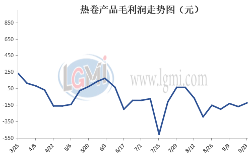 截止9月23日,據蘭格鋼鐵云商平臺監測數據顯示,國內熱卷鋼企理論虧損125元,較8月底減虧29元。整體來(lái)看,鐵礦石以及焦炭等原燃料依然處于偏高的位置,但熱卷市場(chǎng)受制于需求端主導成交價(jià)格依然偏弱,也使得鋼廠(chǎng)熱卷利潤一直處于虧損的情況。