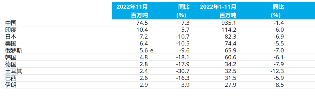 e -預估值。排名依據為本年度累計粗鋼產(chǎn)量。