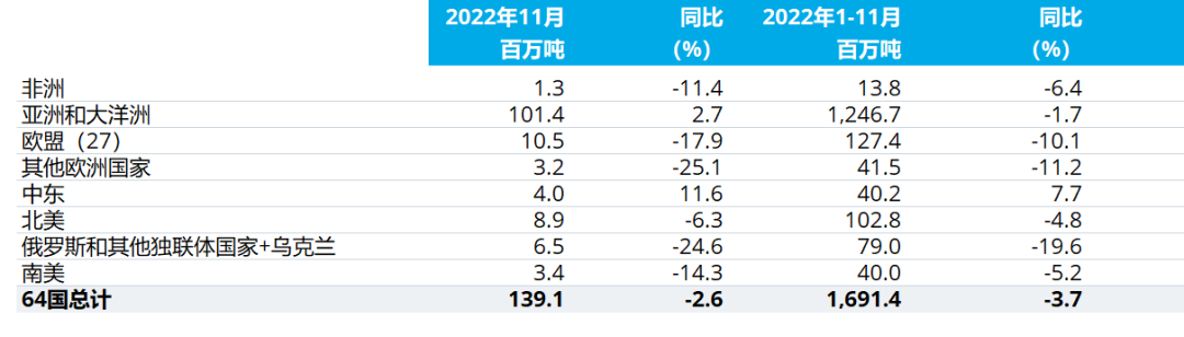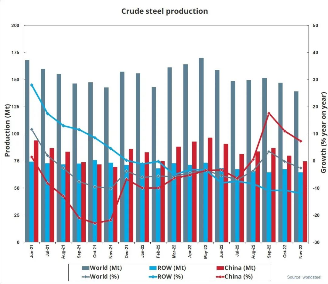 2022年11月全球64個(gè)納入世界鋼鐵協(xié)會(huì )統計國家的粗鋼產(chǎn)量為1.391億噸,同比下降2.6%。