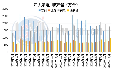 家電方面整體表現差強人意。國家統計局數據顯示,2022年1-11月份四大家電產(chǎn)量總量為54643.9萬(wàn)臺,同比增加9377.3萬(wàn)臺。具體細分品種來(lái)看,1-11月全國空調累計產(chǎn)量20449.4萬(wàn)臺,同比增長(cháng)2%。1-11月全國冰箱累計產(chǎn)量7917.5萬(wàn)臺,同比下降3.7%。1-11月洗衣機累計產(chǎn)量8271.1萬(wàn)臺,同比增長(cháng)4.5%。1-11月彩電累計產(chǎn)量17851.3萬(wàn)臺,同比增長(cháng)7.8%。