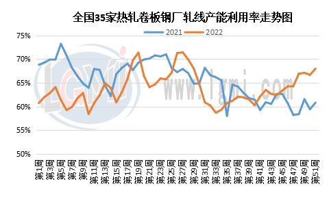 2022年國內35家熱卷鋼廠(chǎng)軋線(xiàn)產(chǎn)能利用率有所走低。據蘭格鋼鐵網(wǎng)統計數據顯示,2022年國內35家鋼廠(chǎng)熱軋卷板產(chǎn)能利用率為63.79%,較上年同期下降1.80個(gè)百分點(diǎn)。但是從數據面也可以看出, 10月份以來(lái)熱卷軋線(xiàn)開(kāi)工率較去年同期存在一定程度上的回升,主要受政策面預期以及業(yè)者對于后市存在一定看好預期支撐,熱卷市場(chǎng)購銷(xiāo)氣氛溫和好轉帶動(dòng)鋼廠(chǎng)軋線(xiàn)開(kāi)工率有所上行。