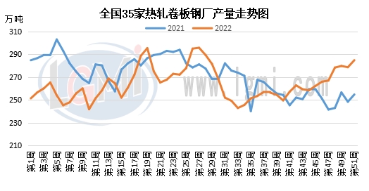 2022年我國熱軋卷板產(chǎn)量較去年同期有所下降。蘭格鋼鐵網(wǎng)統計的全國35家熱卷鋼廠(chǎng)主要指標顯示,2022年全年35家鋼廠(chǎng)熱軋卷板累計產(chǎn)量為13479萬(wàn)噸,同比減少378.7萬(wàn)噸。從2022年數據來(lái)看,全國35家熱卷鋼廠(chǎng)產(chǎn)量高位集中在二季度,***低值出現在三月上旬為241.86萬(wàn)噸,***高值出現在7月中旬,為295.75萬(wàn)噸,后期受熱卷價(jià)格下行行情導致鋼廠(chǎng)熱卷軋線(xiàn)虧損加重影響,熱卷產(chǎn)量高位下行。