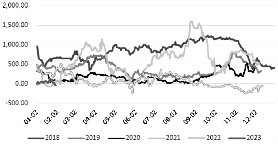 對于螺礦比套利配比的確定一般有兩種方式:一種是從螺紋鋼實(shí)際生產(chǎn)出發(fā),按所消耗對應數量原料和產(chǎn)出對應數量成品之間的生產(chǎn)配比,另一種是從期貨合約價(jià)值角度出發(fā),在合約價(jià)值相等的情況下確定的配比。具體來(lái)看,***,按照生產(chǎn)配比,即按照螺紋鋼生產(chǎn)成本占比,1噸螺紋鋼需要消耗1.6噸鐵礦石及0.5噸焦炭,因此,期貨端也應該按照1噸螺紋鋼對1.6噸鐵礦石進(jìn)行配比,結合期貨合約螺紋鋼10噸/手,鐵礦石100噸/手,因此,折算后螺紋鋼和鐵礦石期貨手數配比是100:16。這樣做的好處是可以進(jìn)一步增加焦炭的成本,進(jìn)一步貼合鋼廠(chǎng)的生產(chǎn)成本,則螺紋鋼、鐵礦石、焦炭期貨手數配比為100:6:5。第二,按照合約價(jià)值配比,即螺紋鋼和鐵礦石期貨合約價(jià)值相等原則。若螺紋鋼和鐵礦石盤(pán)面價(jià)格分別為4100元/噸和840元/噸,那么對應的合約價(jià)值分別是41000元/手和84000元/手。螺紋鋼和鐵礦石的期貨合約手數配比大約是2:1。